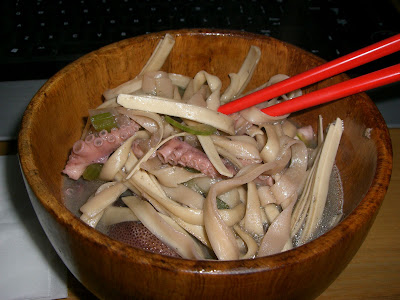 Not to sound to ignorant of fish preparation, I ate at a restaurant with some professors last night. We had whole squid. They were about six inches long each. They were whole. They tasted delicious. I suppose that squid and octopus need to be prepared differently. Anyways, the part of the soup with tentacles is delicious, I can just leave the body out for now.