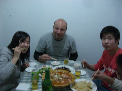 The meal was delicious: eggplant, marinated in oils, fish stew, stringy potato with sauces, pork and mushrooms, and Chingdao beer. After lunch, since they paid for it, I decided they deserved a good western style dinner: Steak and Potatoes, Texas style. So, we went shopping to try and find some good beef. it took us attempts at three grocery stores, and two street markets to find beef. Once, we found it I purchased up three large slabs of beef, some russet potatoes, some salt, pepper, and four coca colas. That is pretty American! I made them steak and potatoes for dinner. They were not used to eating so much beef, and it took them some time to get used to it. They finished their meal.